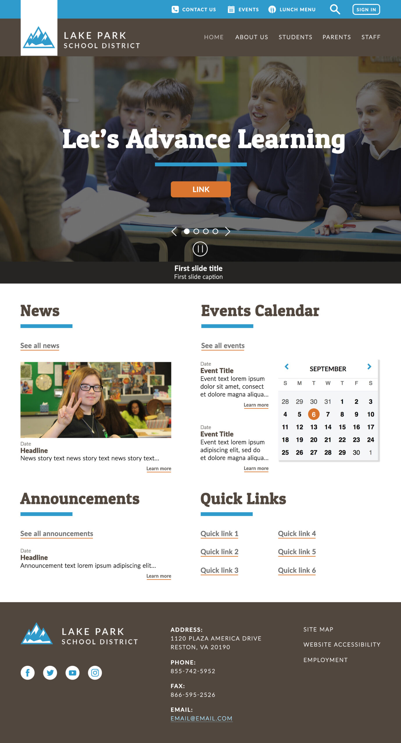 Original design for an educational website. This design was created in response to design requirements including header with navigation and search functions, contact info, image carousel, news content, announcements, social media links, admin sign-in, and more. Colors and fonts were chosen for accessibility and legibility, and to create an authoritative yet welcoming feel that is appropriate for education. To achieve visual cohesion, I also created custom icon illustrations. Home page is shown here.